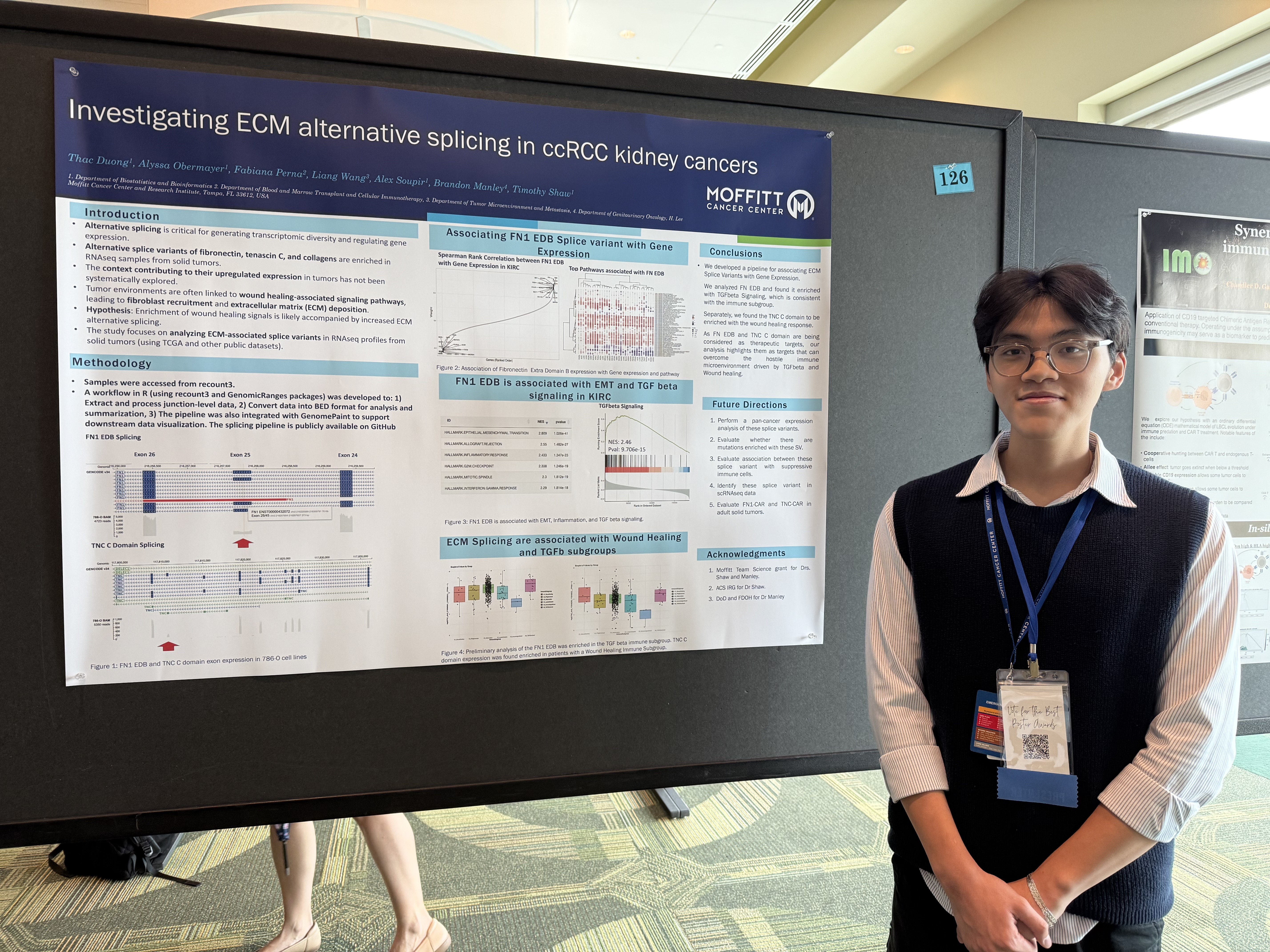 - Props to Ken Dao for giving a poster presentation as an undergrad at the ASH Annual Meeting 2024 and ORIEN 2024 titled "Inflammatory Transcriptional Signature Can Discriminate De Novo and Secondary AML." Here's a video of Ken interviewed by Moffitt News. Well done! 12/6/2024